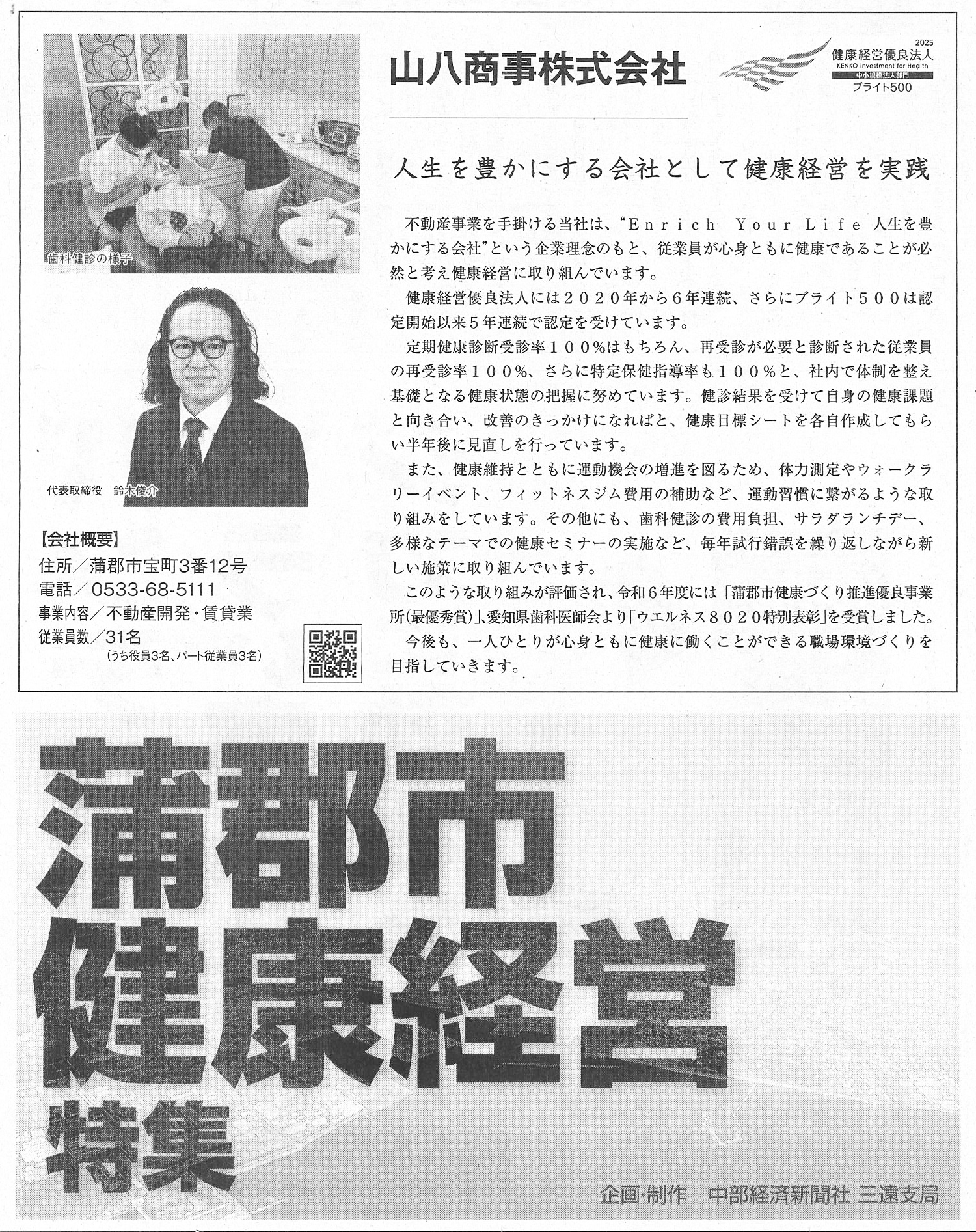 中部経済新聞2025年10月30日の蒲郡市健康経営特集に山八商事が掲載されました。